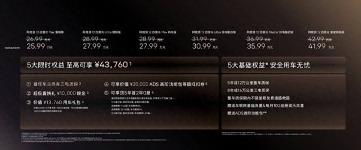 近日配资查询,阿维塔12四激光版正式上市,推出纯电、增程双动力共计6个车型版本,官方指导价26.99万元至42.99万元,权益后价格下探至25.99万元至41.99万元,并同步推出5大限时购车权益和5年贷款期限内前2年0息金融政策。